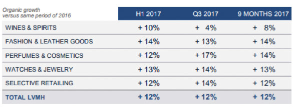 In this difficult market, LVMH sales for the year to date were up 12% as indicated in the table below, with all the five business groups all recording growth above 10%, except wine and spirits (which was constrained by volume!) Watches which had suffered from reduced Chinese demand for a number of years recovered strongly.