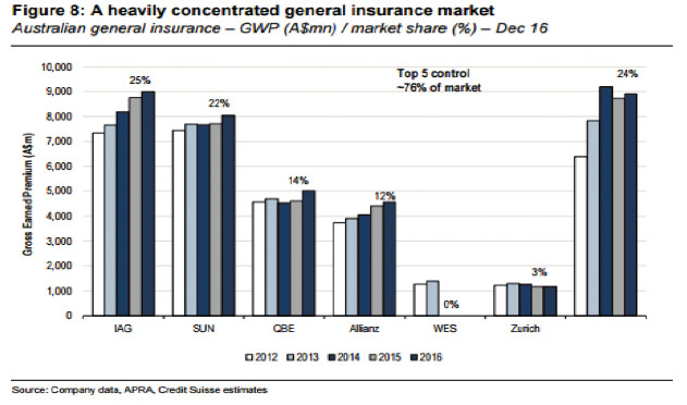 The top 5 insurance providers control around 76% of the market with the top two, IAG and Suncorp combined, comprising just under half.